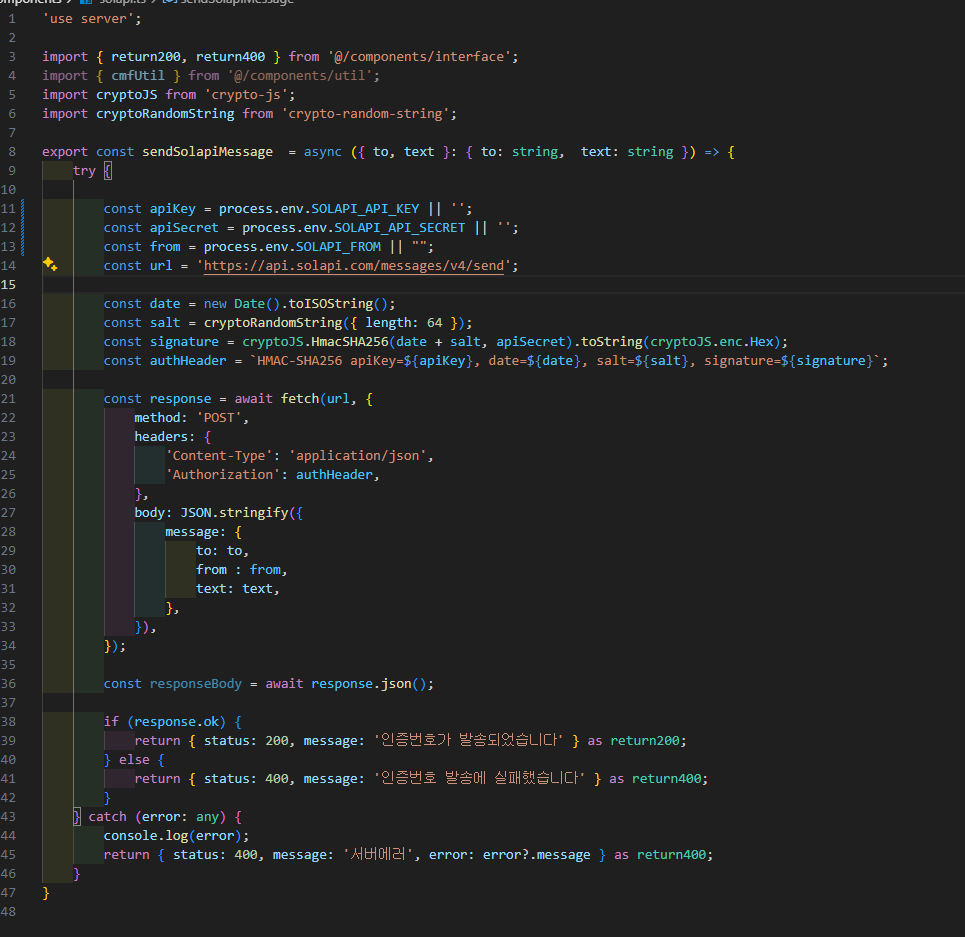 문자 발송 기능을 추가해야해서 처음에는 솔라피 SDK(라이브러리)를 사용하려 했으나, runtime 환경이 Edge여서 동작하지 않아 직접 API 요청을 통해 구현하기로 했습니다.